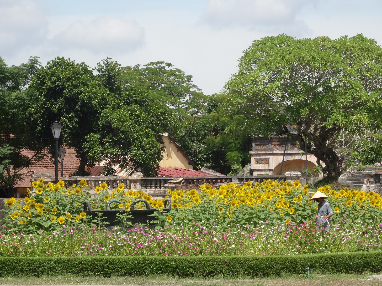 Nous pénétrons dans la Citadelle bâtie entre 1804 et 1832 sous l'empereur Gia Long selon un plan inspiré des fortifications de Vauban. Elle est protégée par 10 km de remparts ainsi que des douves de 40 m de large et couvre une superficie de 520 ha.