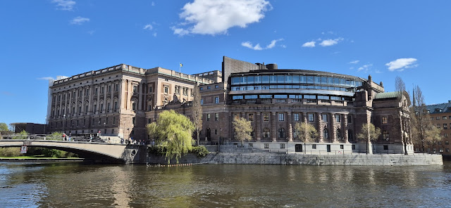 Nous revenons par les quais, avec une vue sur Helgeandsholmen, une petite île située au cœur de la ville et faisant partie de Gamla Stan, la vieille ville.