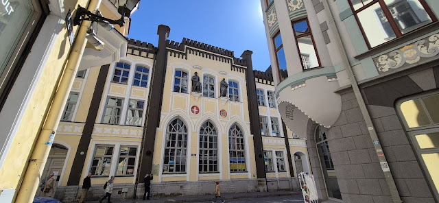 Nous parvenons à la Maison des Têtes Noires. La confrérie ou guilde des Têtes noires était une association de marchands célibataires, d'armateurs et d'étrangers, active en Livonie (aujourd'hui en Estonie et en Lettonie) à partir du 14°s. jusqu'en 1940.